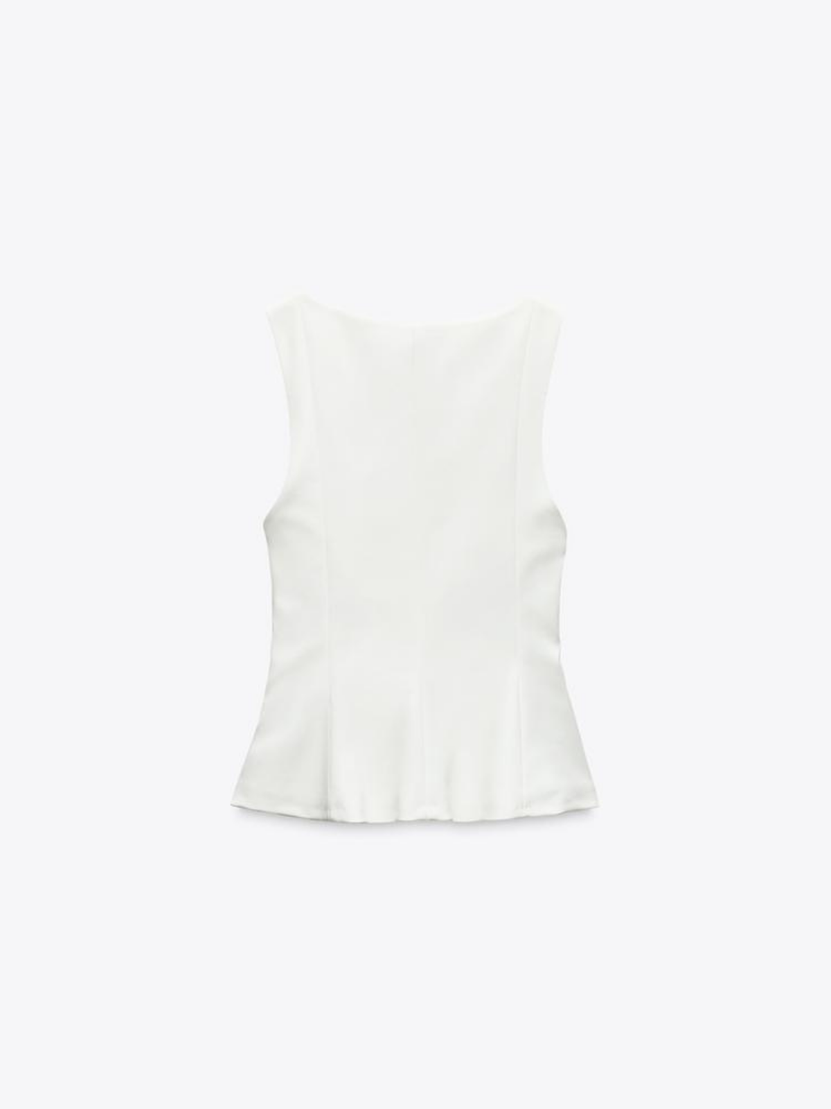 Design: A sophisticated sleeveless top with a sharp square neckline, a slim-fit corset that flatters the silhouette, and a peplum hem that adds a feminine touch and structure.